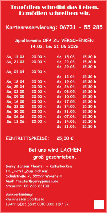 Da die Sonntagvorstellung um 19.00 h vielen unserer Gästen im Hinblick auf das frühe